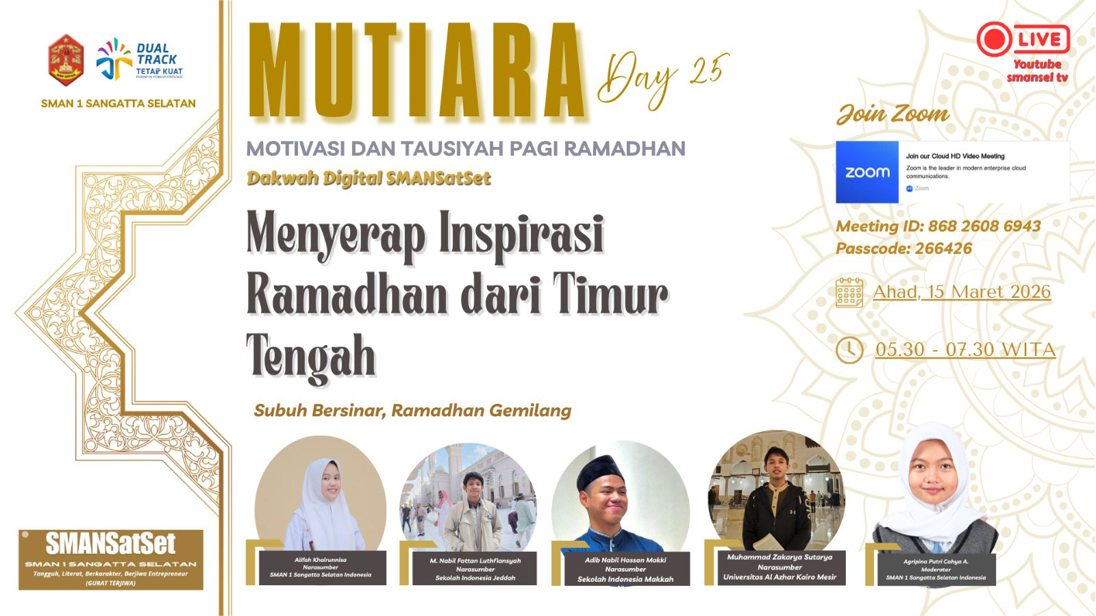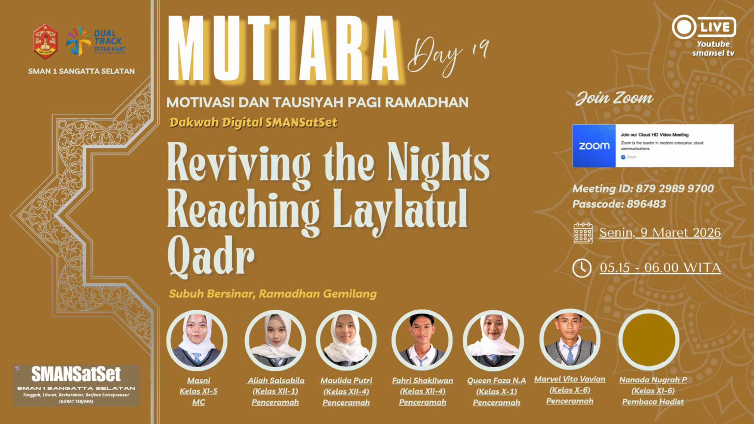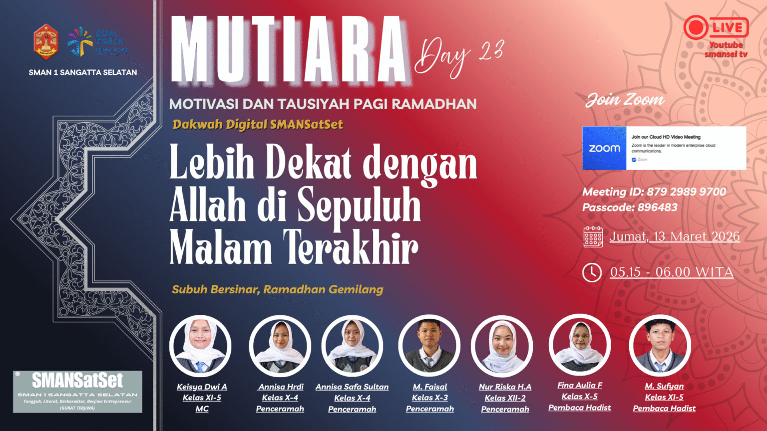 Setiap hari pukul 05.15 WITA, keluarga besar SMAN 1 Sangatta Selatan melaksanakan kajian Subuh melalui Zoom Dakwah dan siaran langsung YouTube. Mengawali hari dengan ilmu, menenangkan hati dengan dzikir, dan menguatkan iman dalam kebersamaan.